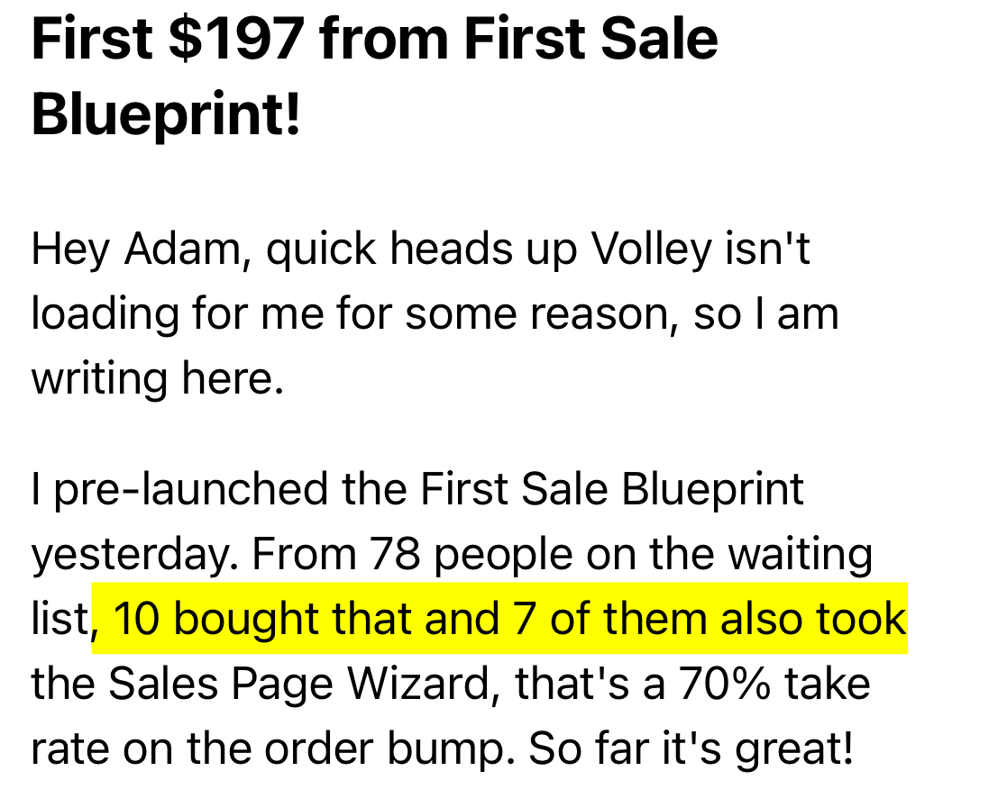 I got this email yesterday: This is from a done-for-you client I'm working with. He pre-launched his First Sale Blueprint (a custom GPT I built for him). 78 people on the waiting list. 10 people grabbed it. 7 of those grabbed the order bump, which is a 70% take rate (I'm happy with a 30% conversion rate on my bump offers) His bump offer is a sales page custom GPT that I built as well. It's slick. He also shared that 1 person grabbed his $97 upsell. The funny thing? He told me the upsell page...